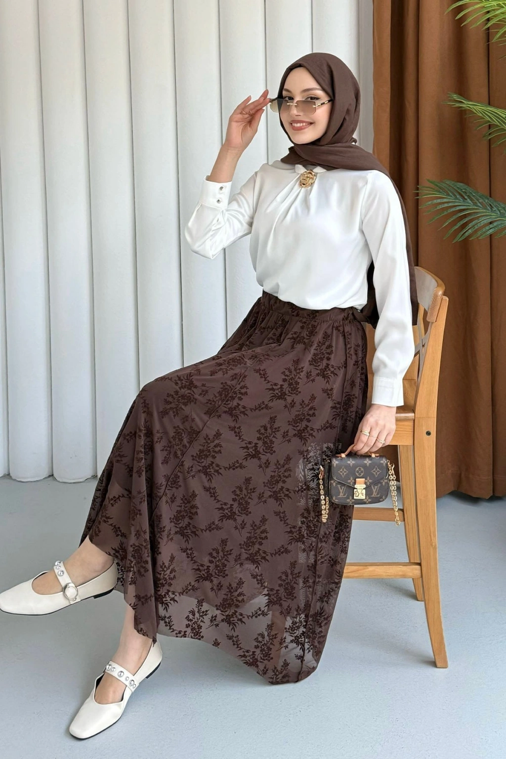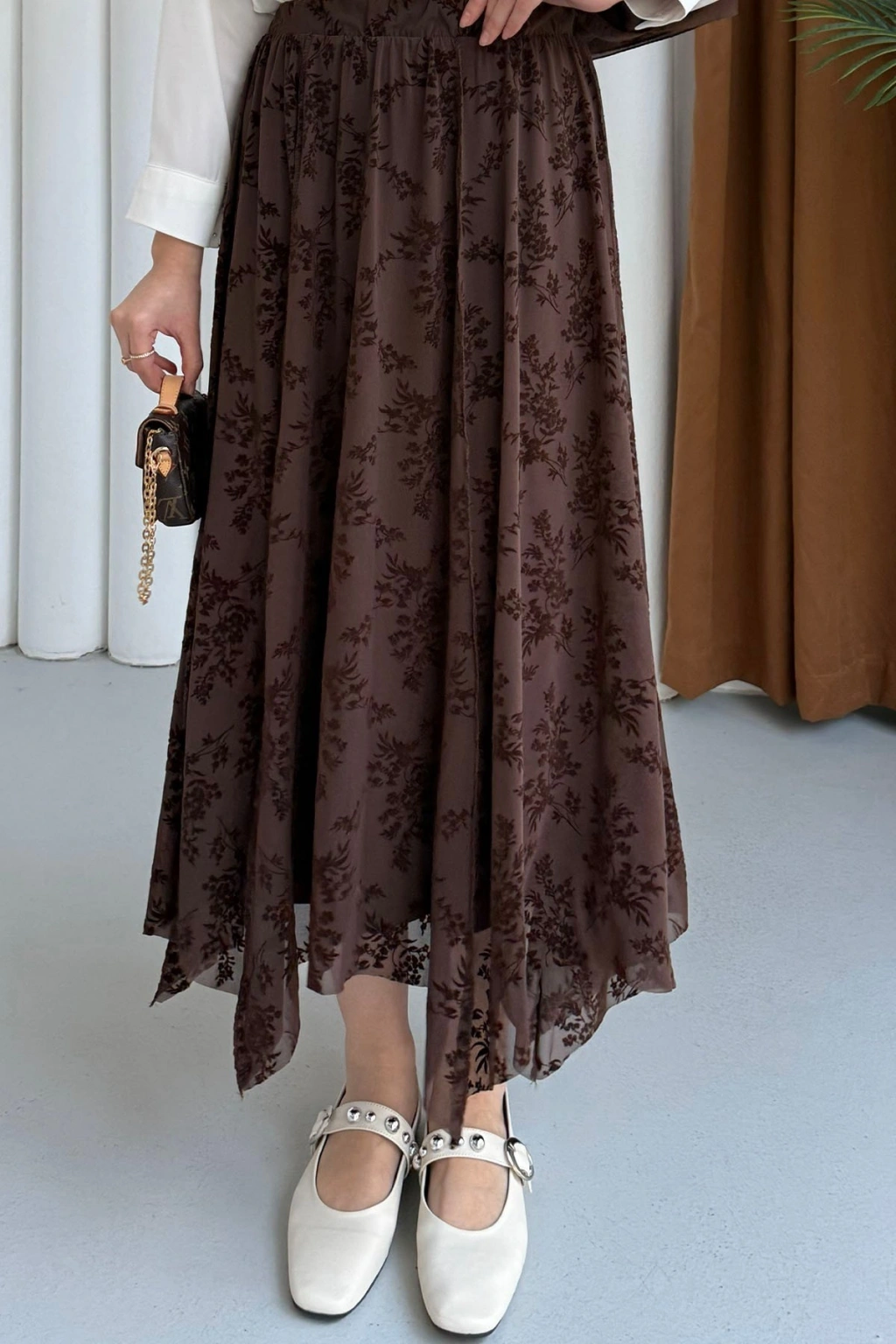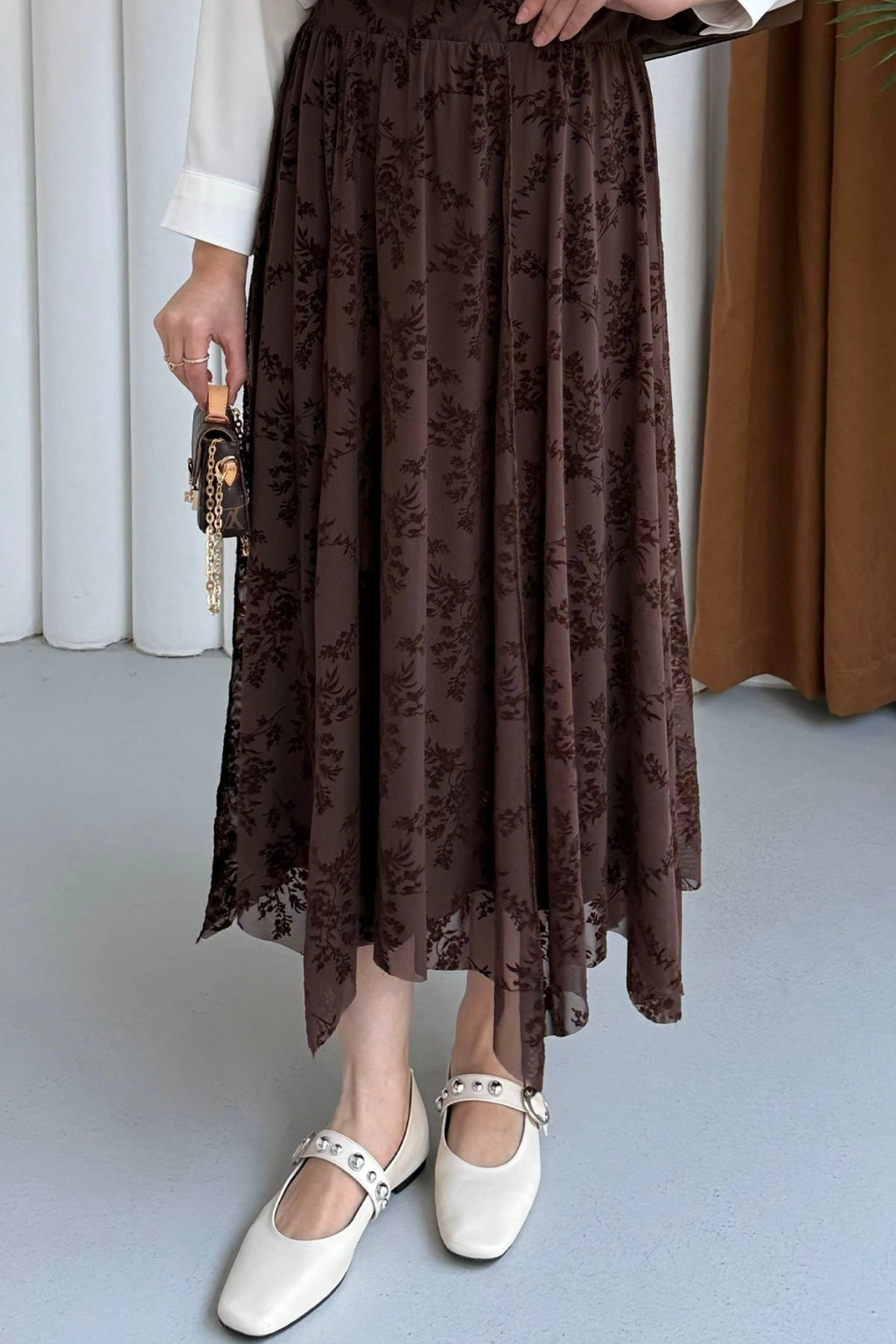 Güpür Detaylı Asimetrik Kesim Tül Etek - Kahverengi