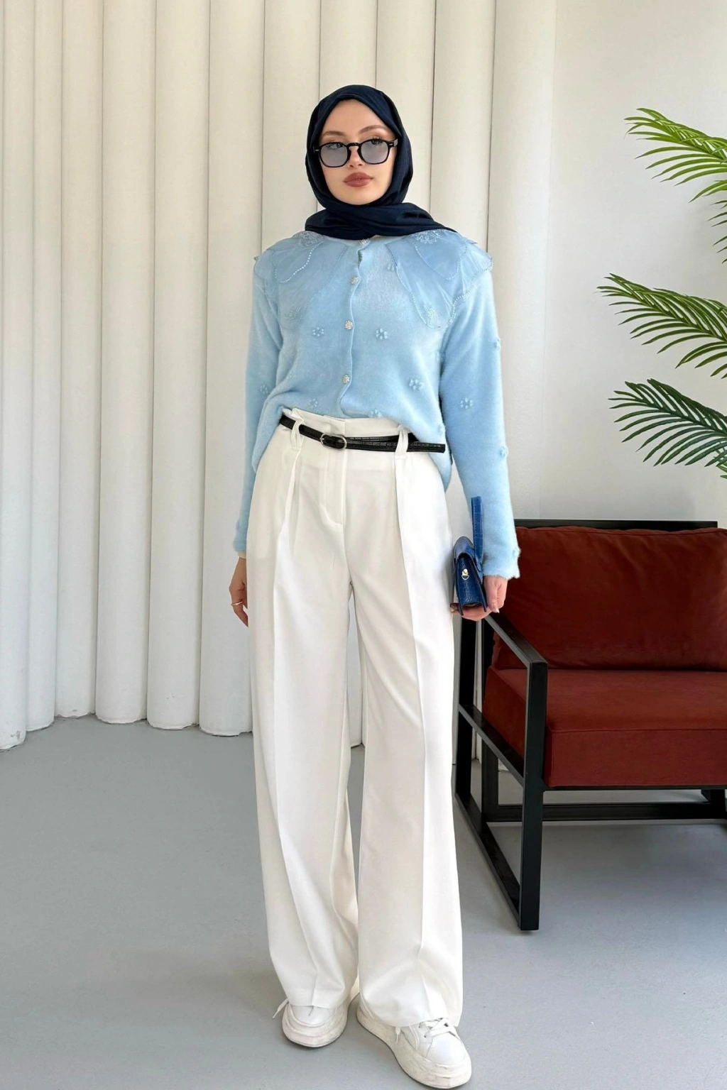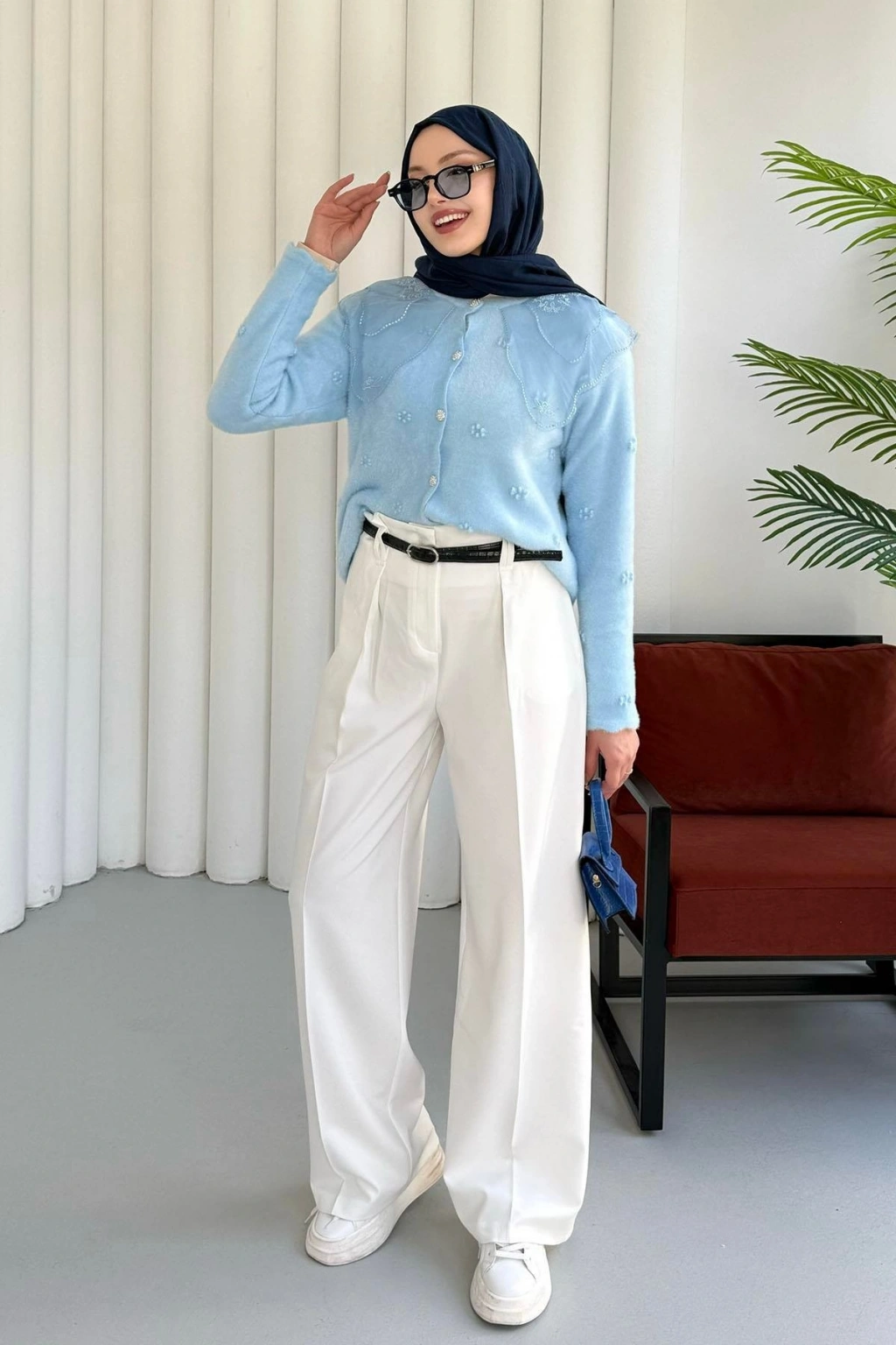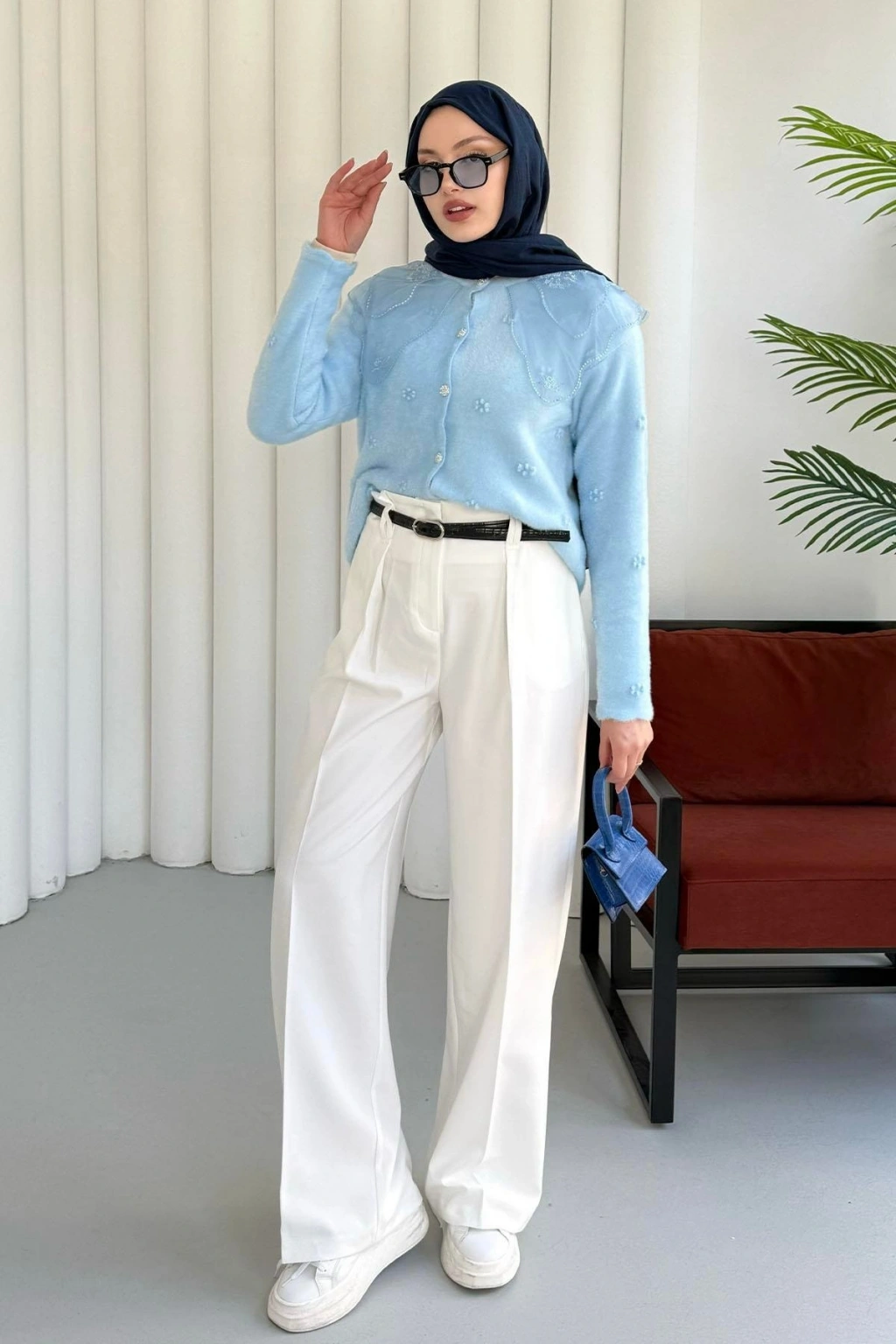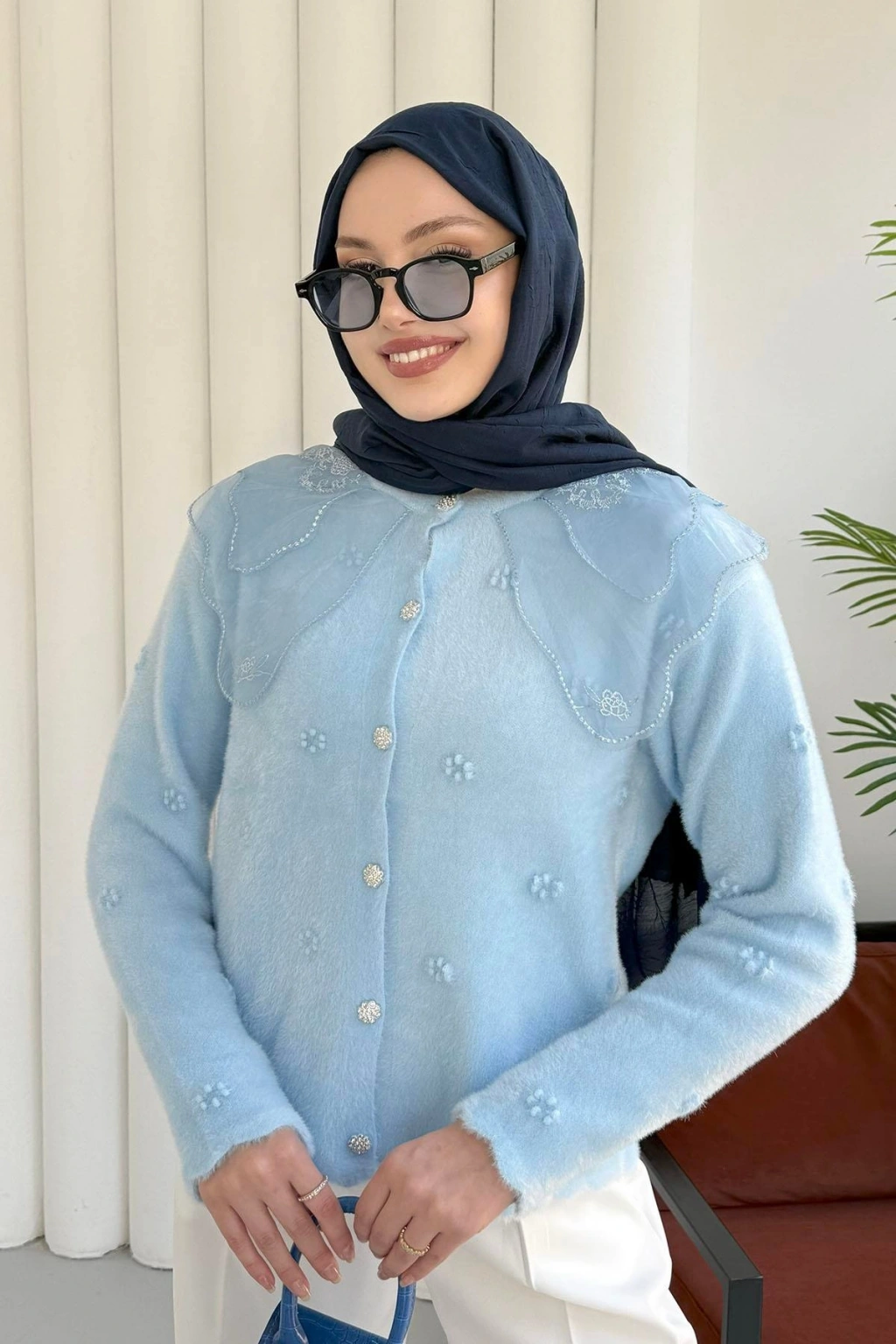 Dantel Yaka Angora Hırka - Mavi