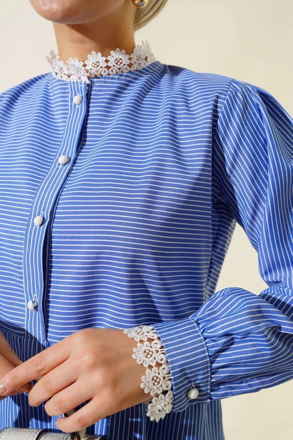 - Rahat kalıbı ile günlük kullanımda konfor sunan dantel yaka çizgili gömlek, hareket özgürlüğünüzü kısıtlamaz; - Poplin kumaş yapısı sayesinde dayanıklılığı ve nefes alabilirliği bir arada sunar, uzun süreli kullanımlarda bile formunu korur; - Şık çizgili deseniyle göz alıcı bir görünüm kazandırırken, dantel detayları ile zarif bir dokunuş ekler; - Uzun kollu tasarımı ile mevsim geçişlerinde ideal bir tercihtir; serin havalarda sizi sıcak tutarken şıklığınızdan ödün vermezsiniz; - Standart boy kesimiyle farklı vücut tiplerine uyum sağlar ve her tür alt giyimle kolayca kombinlenebilir; - İpliği boyalı materyali sayesinde renklerin canlılığını uzun süre muhafaza eder ve solma yapmaz; - Tüm yaş gruplarına hitap eden tasarımıyla geniş bir kullanıcı yelpazesine sahiptir; herkes için uygun bir stil sunar; - Geri dönüştürülmüş malzemeden üretilmiş olması çevre dostu bir tercih olmasının;