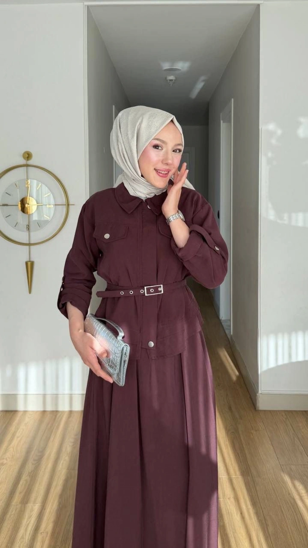 Ece Çıtçıt Kapaklı Fermuarlı Kemerli Etekli Takım - Kahverengi