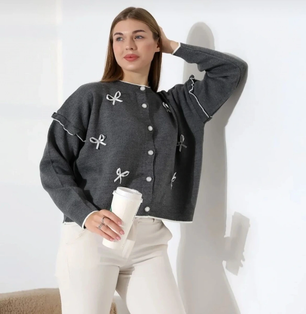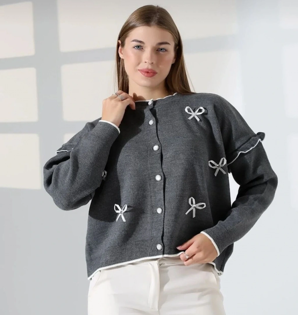 Triko kumaştan üretilen hırka, soğuk havalarda sizi sıcacık tutarken, zarif kurdela detayları da şıklığınıza şıklık katacak.
