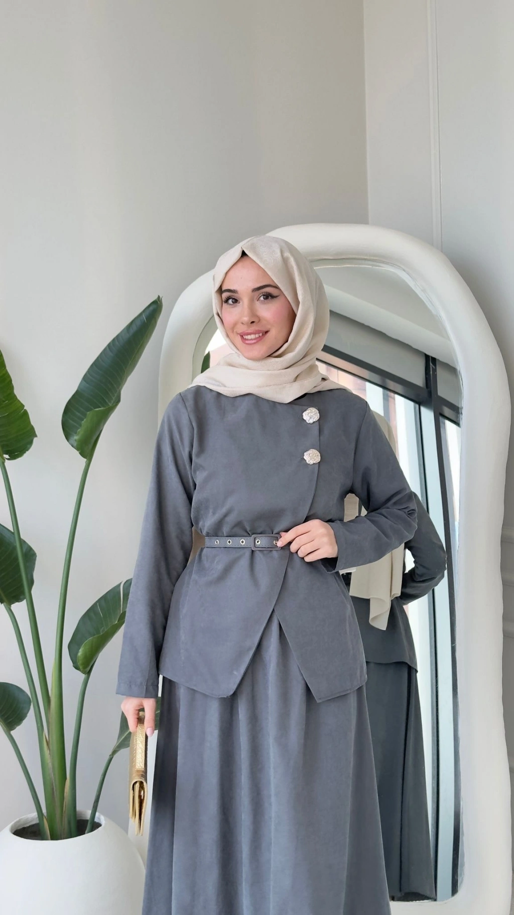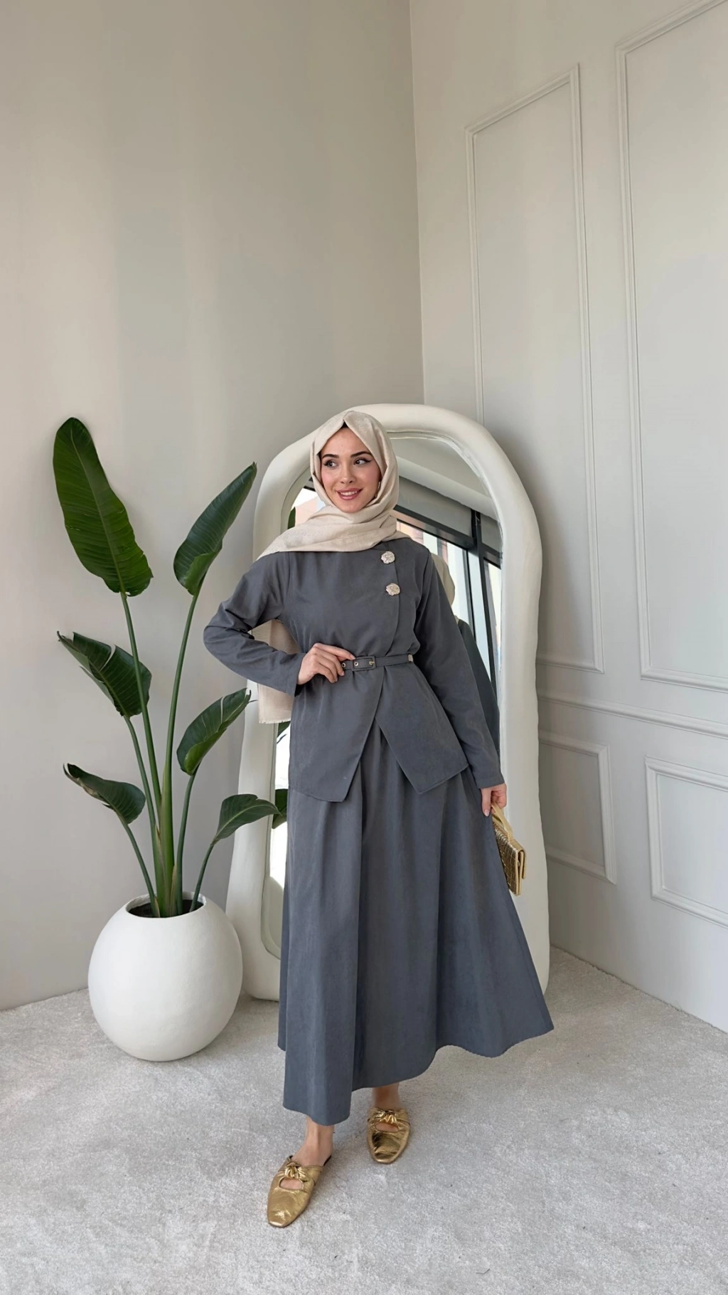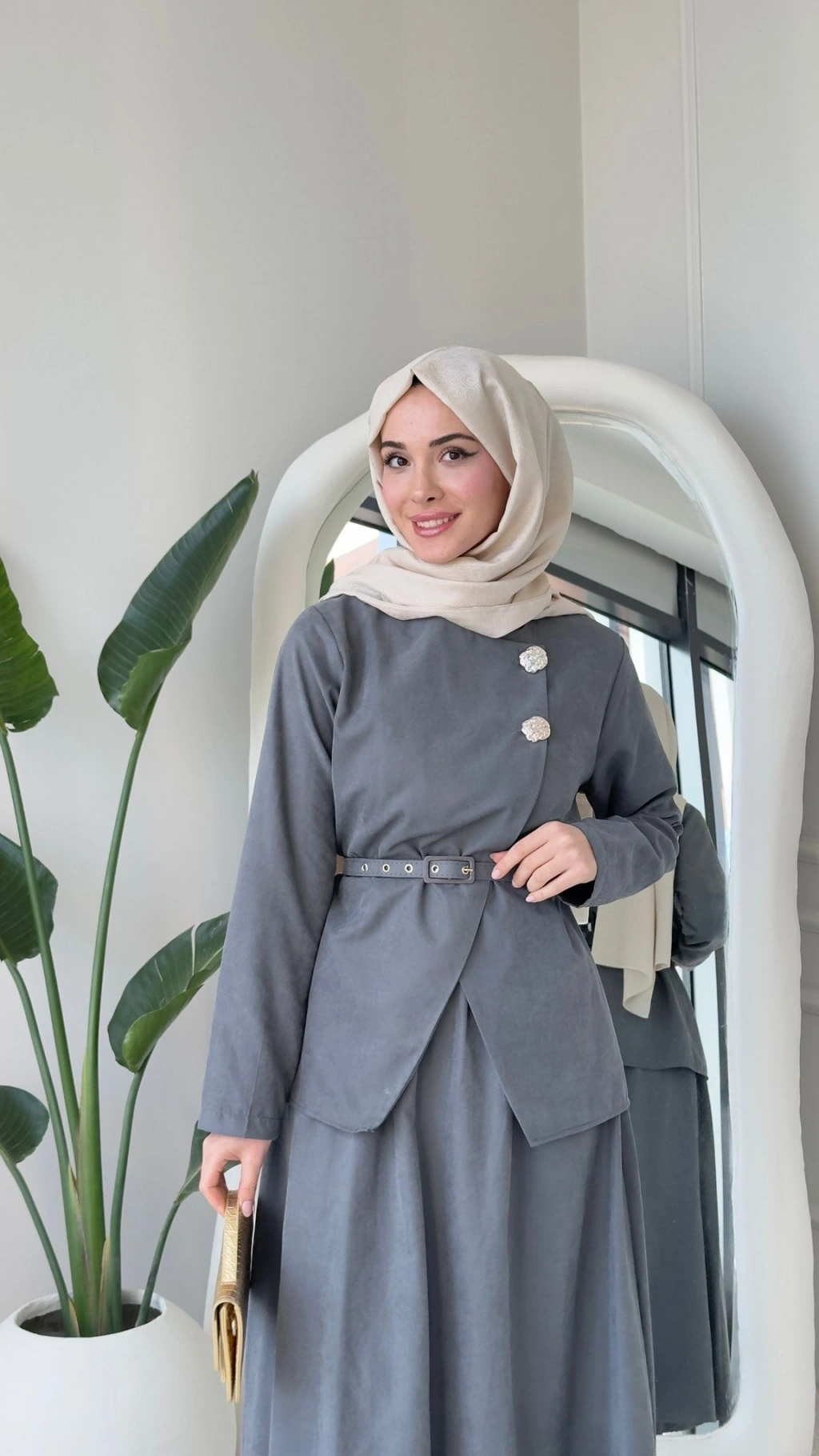 Nevra Çift Düğmeli Kemerli Etekli Takım - Gri
