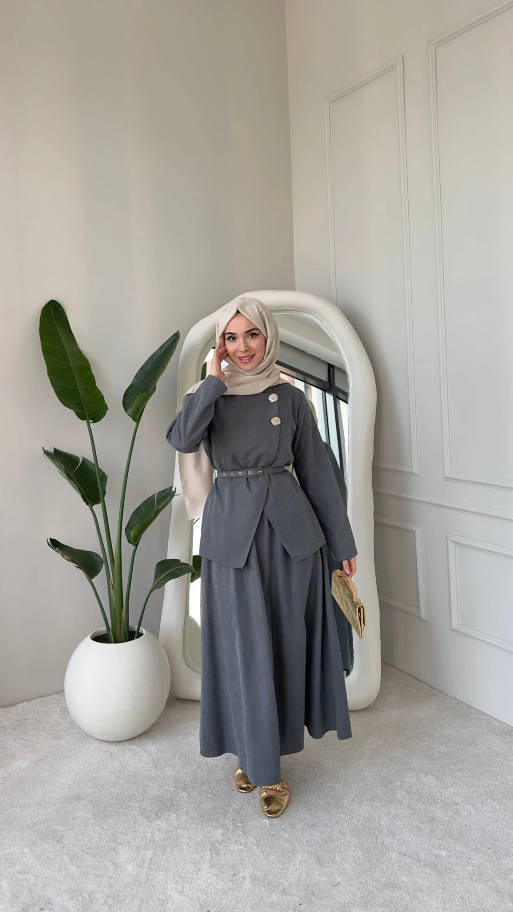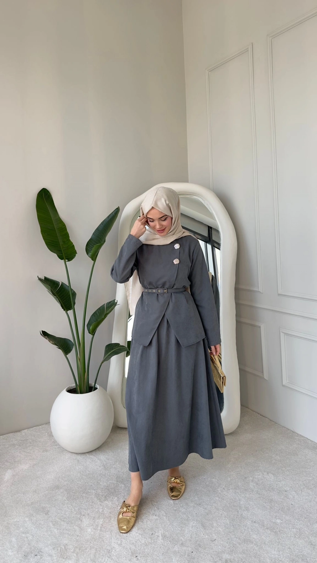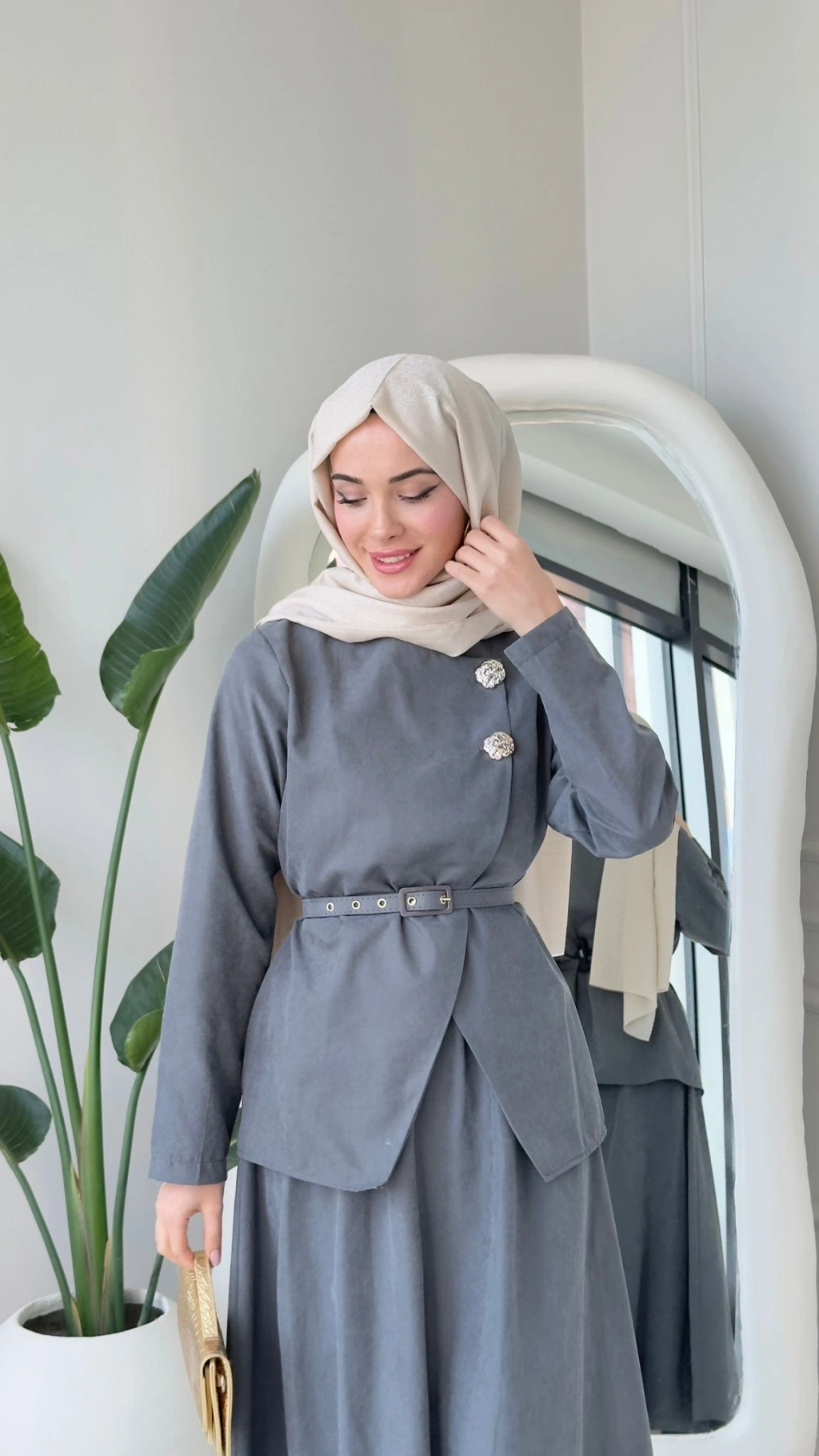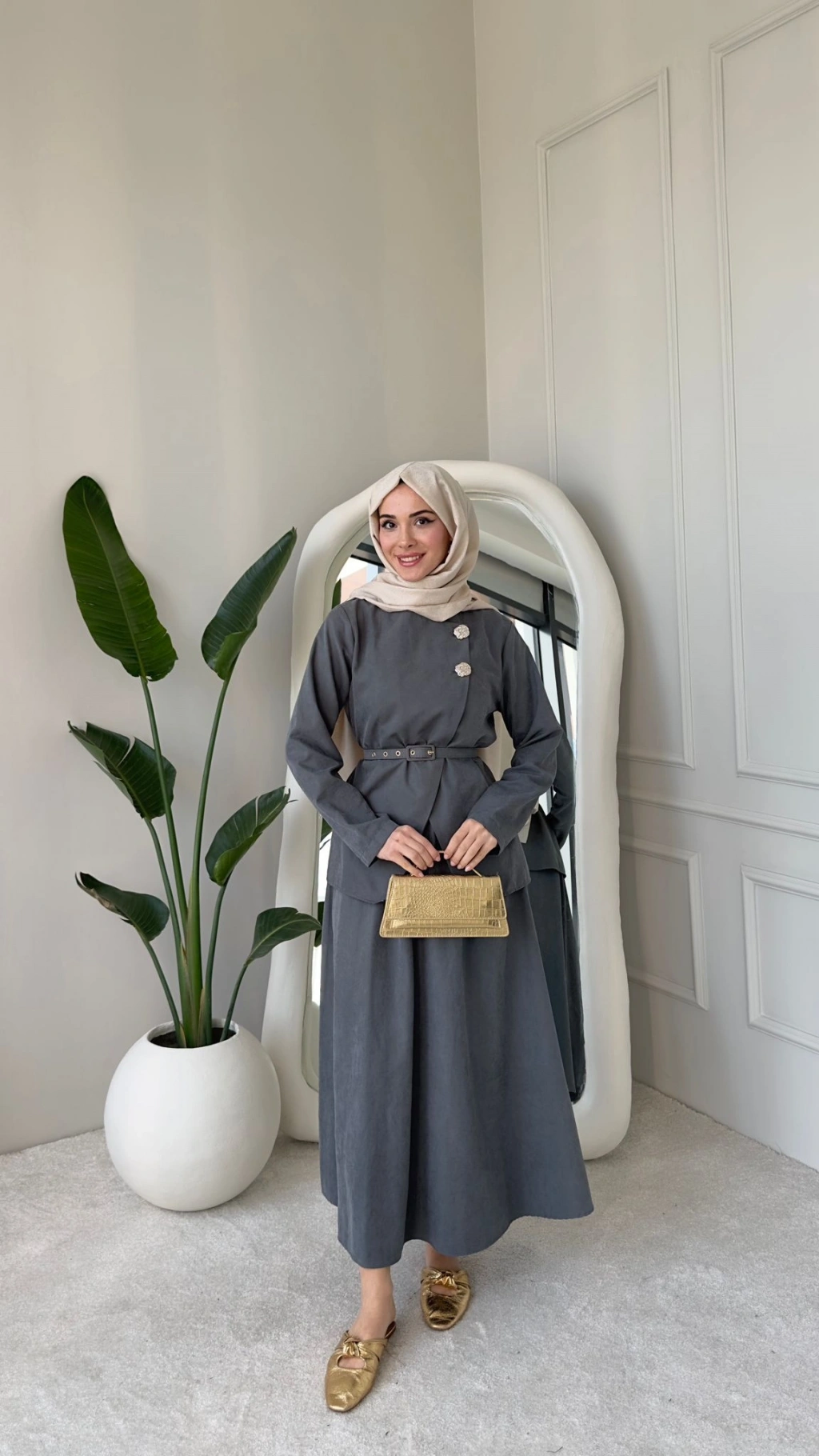 Nevra Çift Düğmeli Kemerli Etekli Takım - Gri