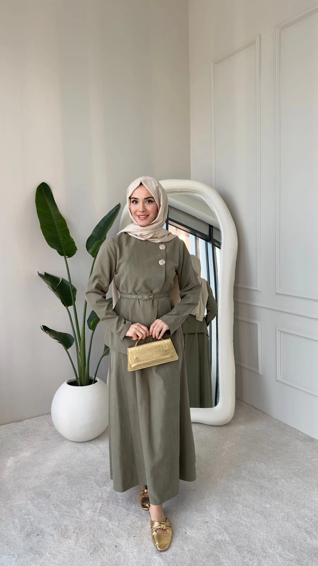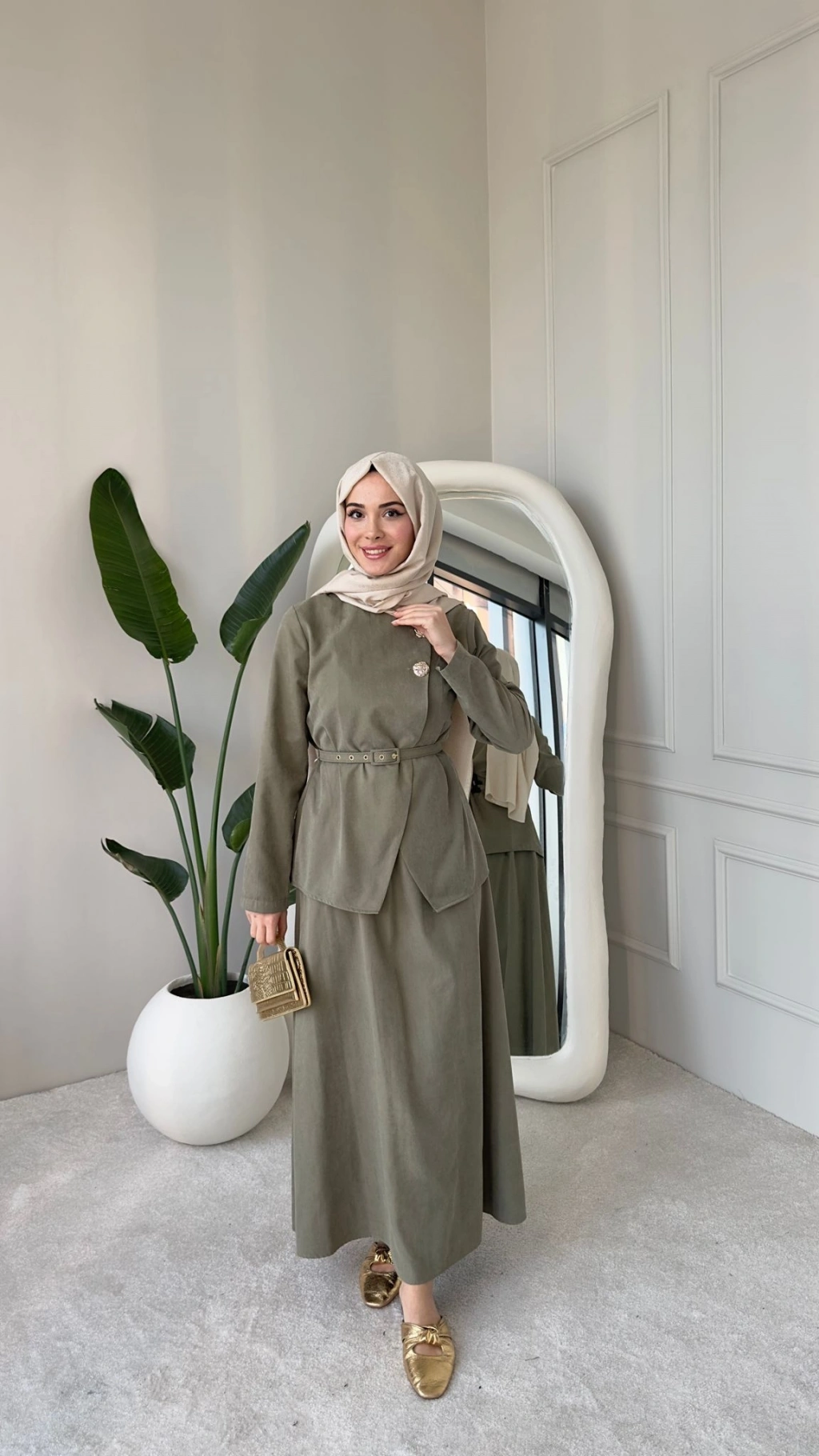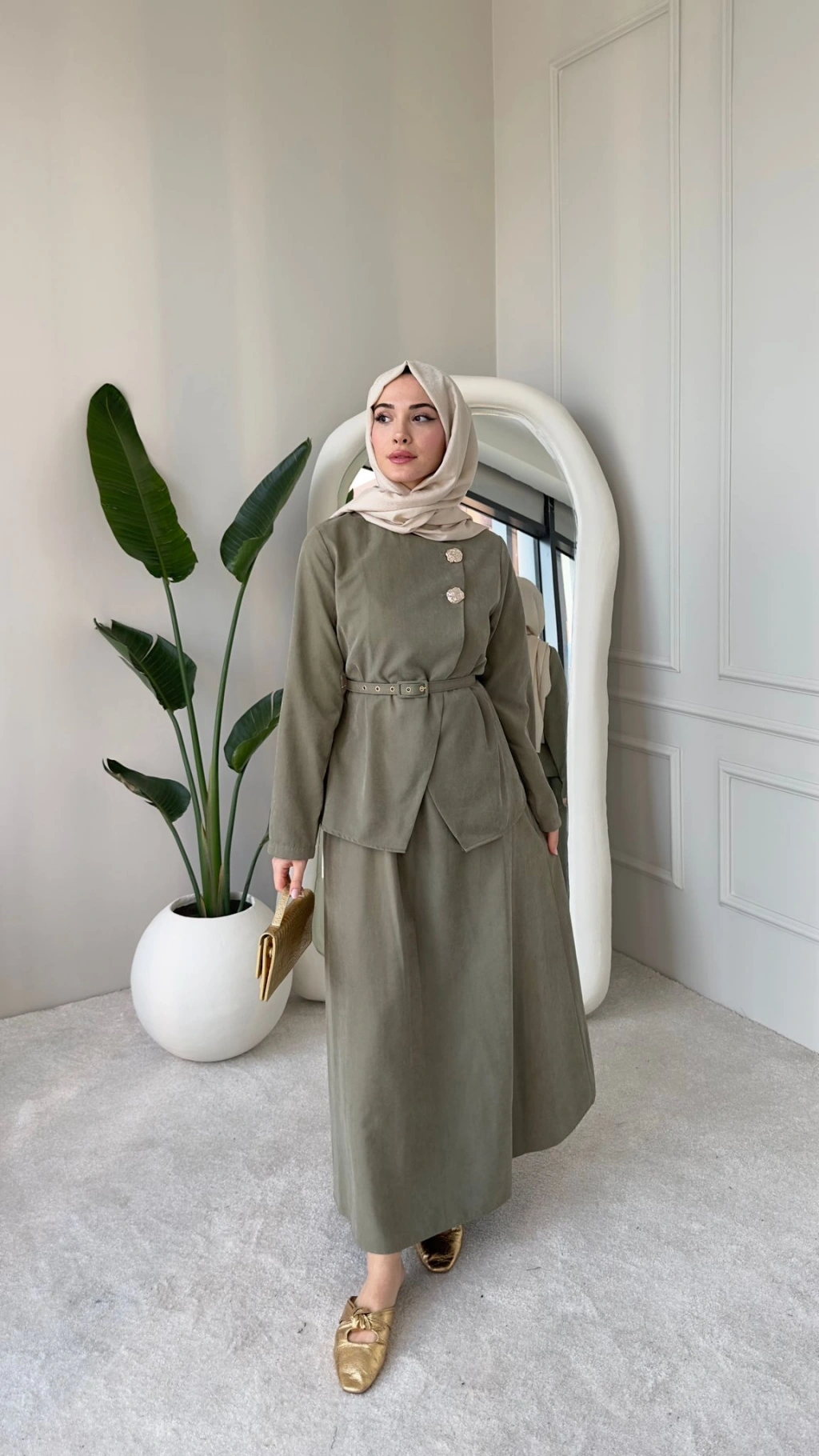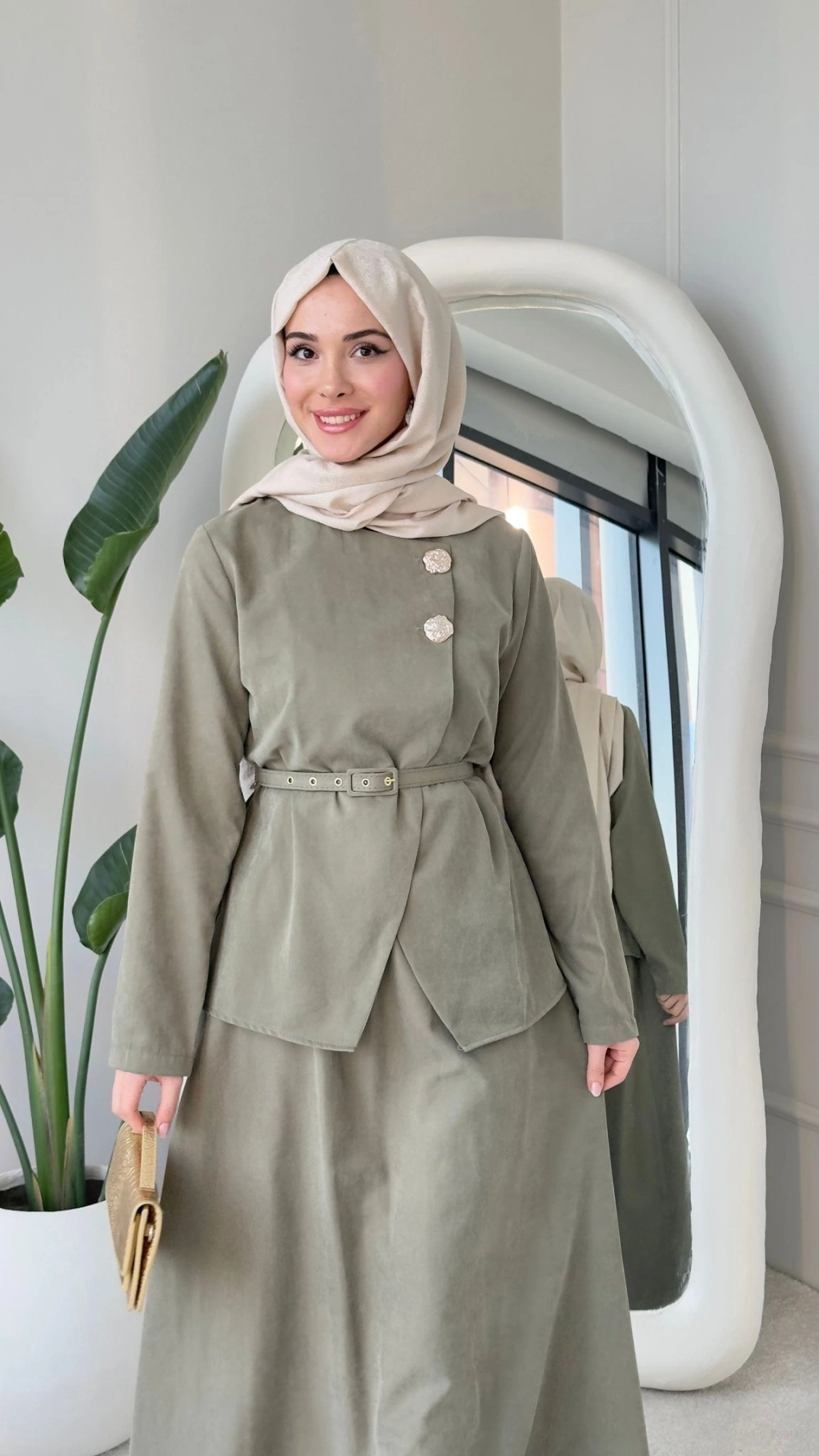 Nevra Çift Düğmeli Kemerli Etekli Takım - Yeşil