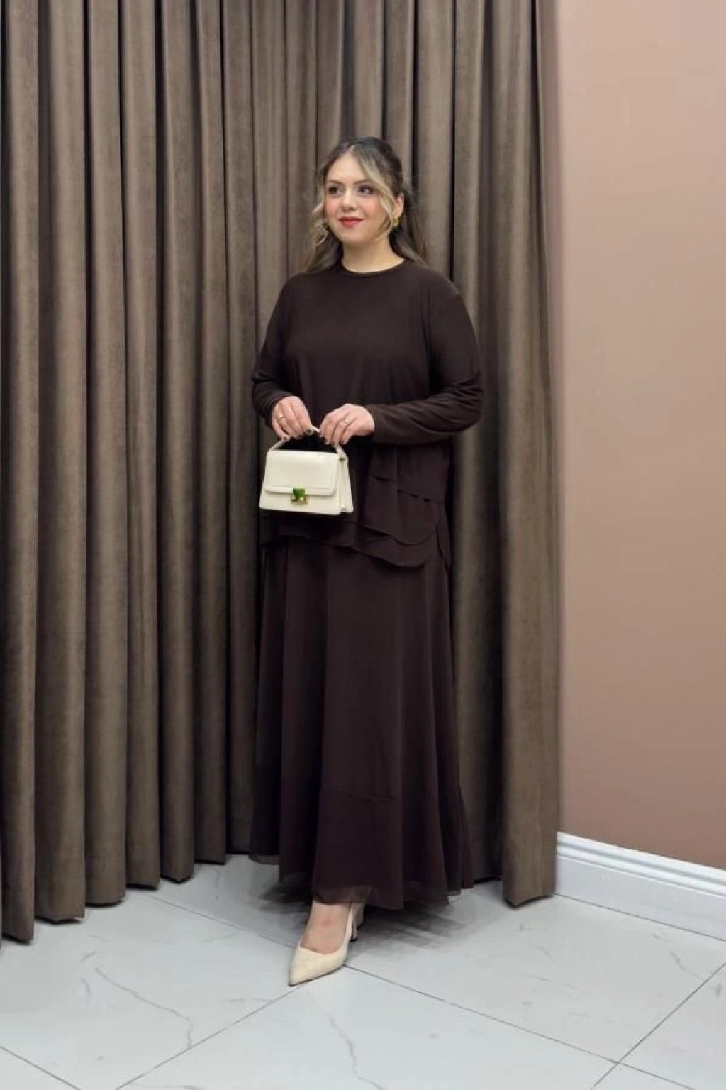 Şifon Detaylı Etekli Takım - Kahverengi
